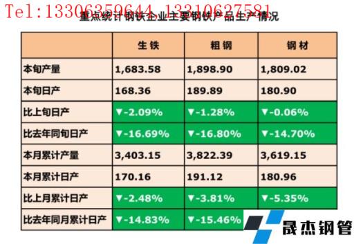 2月24日訊,2月中旬,重點(diǎn)統(tǒng)計(jì)鋼鐵企業(yè)共生產(chǎn)粗鋼1898.9萬(wàn)噸、生鐵1683.58萬(wàn)噸、精密鋼管1809.02萬(wàn)噸。其中,粗鋼日產(chǎn)189.89萬(wàn)噸,環(huán)比下降1.28%;生鐵日產(chǎn)168.36萬(wàn)噸,環(huán)比下降2.09%;精密鋼管日產(chǎn)180.9萬(wàn)噸,環(huán)比下降0.06%。精密鋼管庫(kù)存量1690.35萬(wàn)噸,比上一旬增加4.95萬(wàn)噸,增長(zhǎng)0.29%;比去年同期減少64.38萬(wàn)噸,下降3.67%。