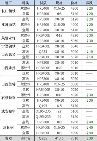 下調(diào)7家,占比63.6%,調(diào)價幅度10-40元/噸;